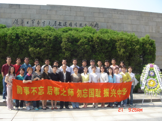 月20日~5月21日,我校教工团在校团委组织下前往南京考察并举行老团员离团仪式。校党委书记姚松芳及支部书记、学生处领导参加了此次活动。5月21日上午,教工团支部在江东门侵华日军南京大屠杀遇难同胞纪念馆举行隆重的悼念仪式暨老团员离团仪式。本次离团教工共17人,教务处李晶代表此次离团的老团员发了言,校党委书记姚松芳也对离团的老团员寄予深切的关怀和期望。在接下来的参观中,当年大屠杀的一名幸存者为我们讲述了当年那一幕不堪回首的往事。团员青年们在参观中感慨万千,更感受到“勿忘国耻,振兴中华”是我们每个中国人的责任。