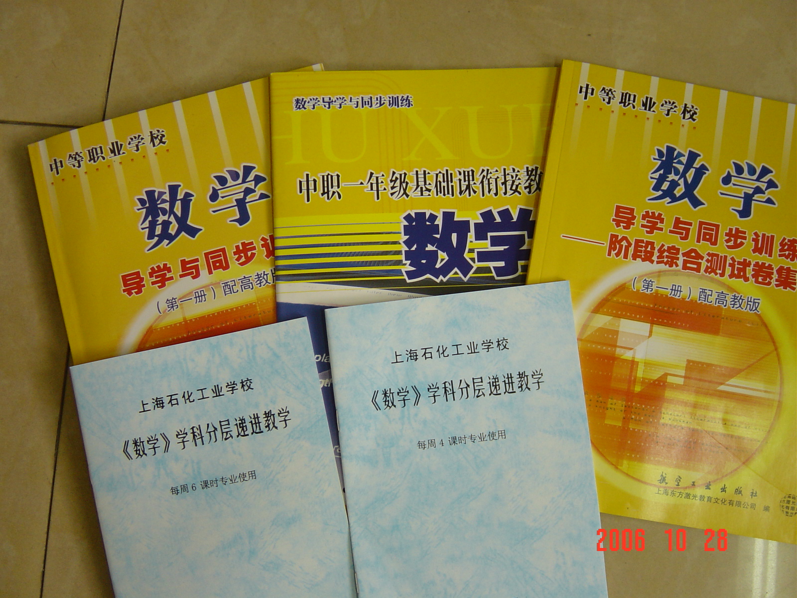 在本学期全市使用新教材,我校专业计划调整的情况下,为了更好地与专业教学目标相配匹,继续开展分层递进教学,数学组全体教师面对新情况,利用暑期认真研究新课程标准和新教材,与兄弟学校一起编写了与新教材配套的数学同步训练,自编了数学校本衔接教材。开学初,结合学校实际分别为每周程课编写了学校分层教学标准手册,为教师和学生对照目标学习提供了清晰的依据。