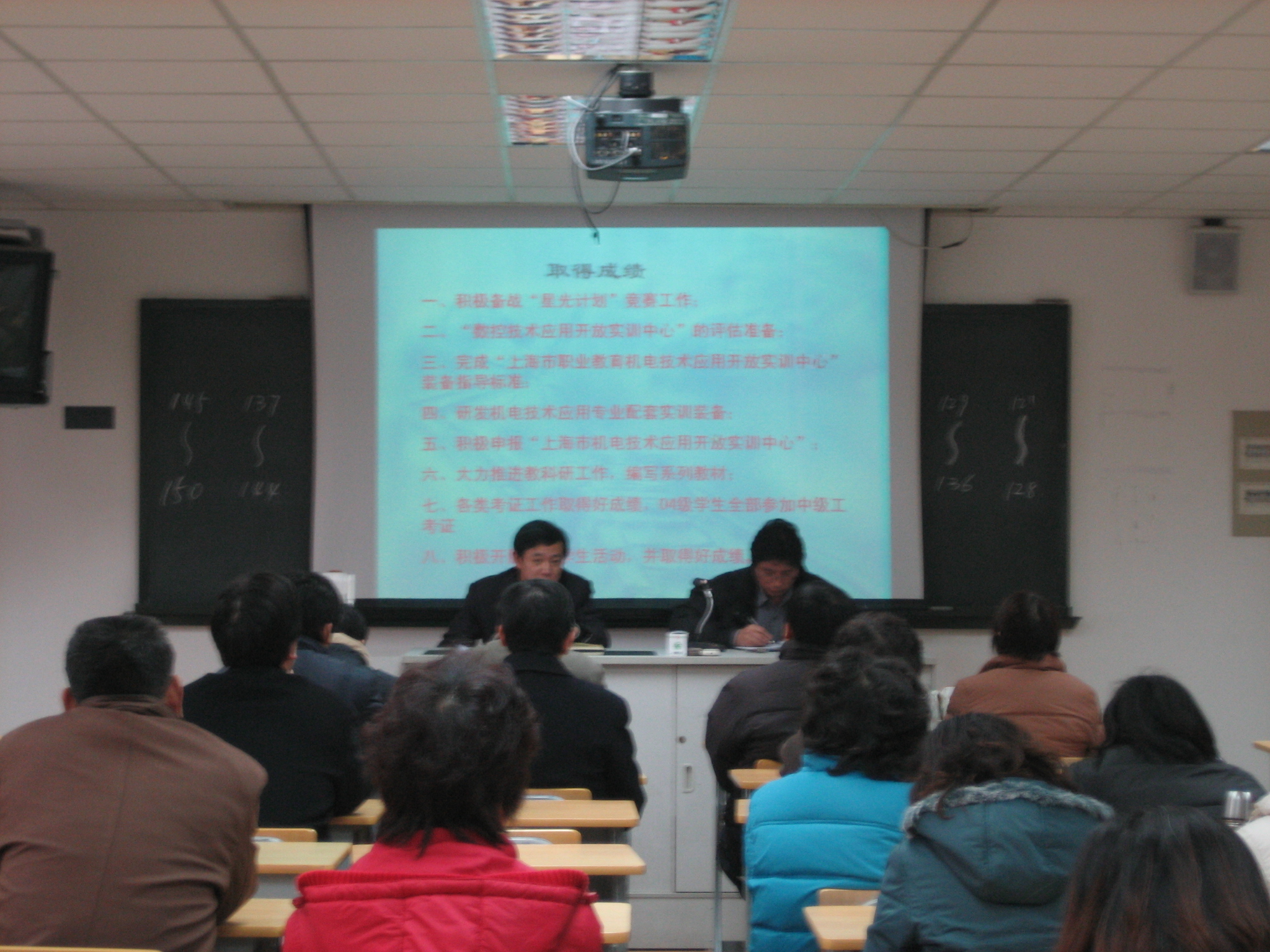 2007年1月22日在北区综合楼A区多媒体教室(四)召开,会议由机电科科长黄汉军主持,机电科全体教师出席了大会。会上黄科长就2006~2007学年第一学期机电科所取得的成绩进行了回顾,就本学期科里所存在的问题进行了详细分析,对绩效奖与考核奖颁发标准以及下学期工作进行了介绍。最后黄科长预祝全体教师新春快乐,并鼓励大家在新的一年里为学校作出更多的贡献。