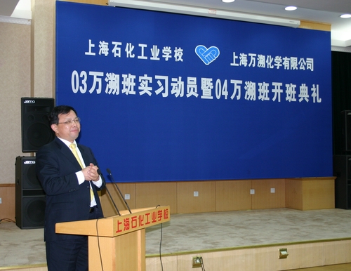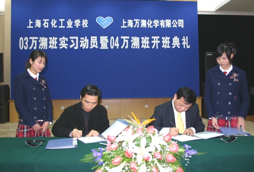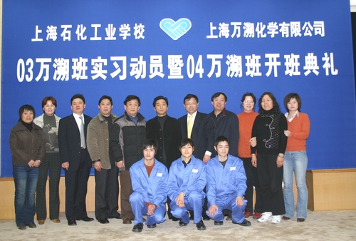 2007年3月6日,在学校多功能厅,迎来了上海石化工业学校与上海万溯化学有限公司“03万溯班实习动员暨04万溯班开班典礼”。上海康鹏化学有限公司总裁杨建华博士、上海万溯化学有限公司副总经理施云和我校副校长林国新等领导出席了庆典活动。活动由化工科副科长沈晨阳主持。