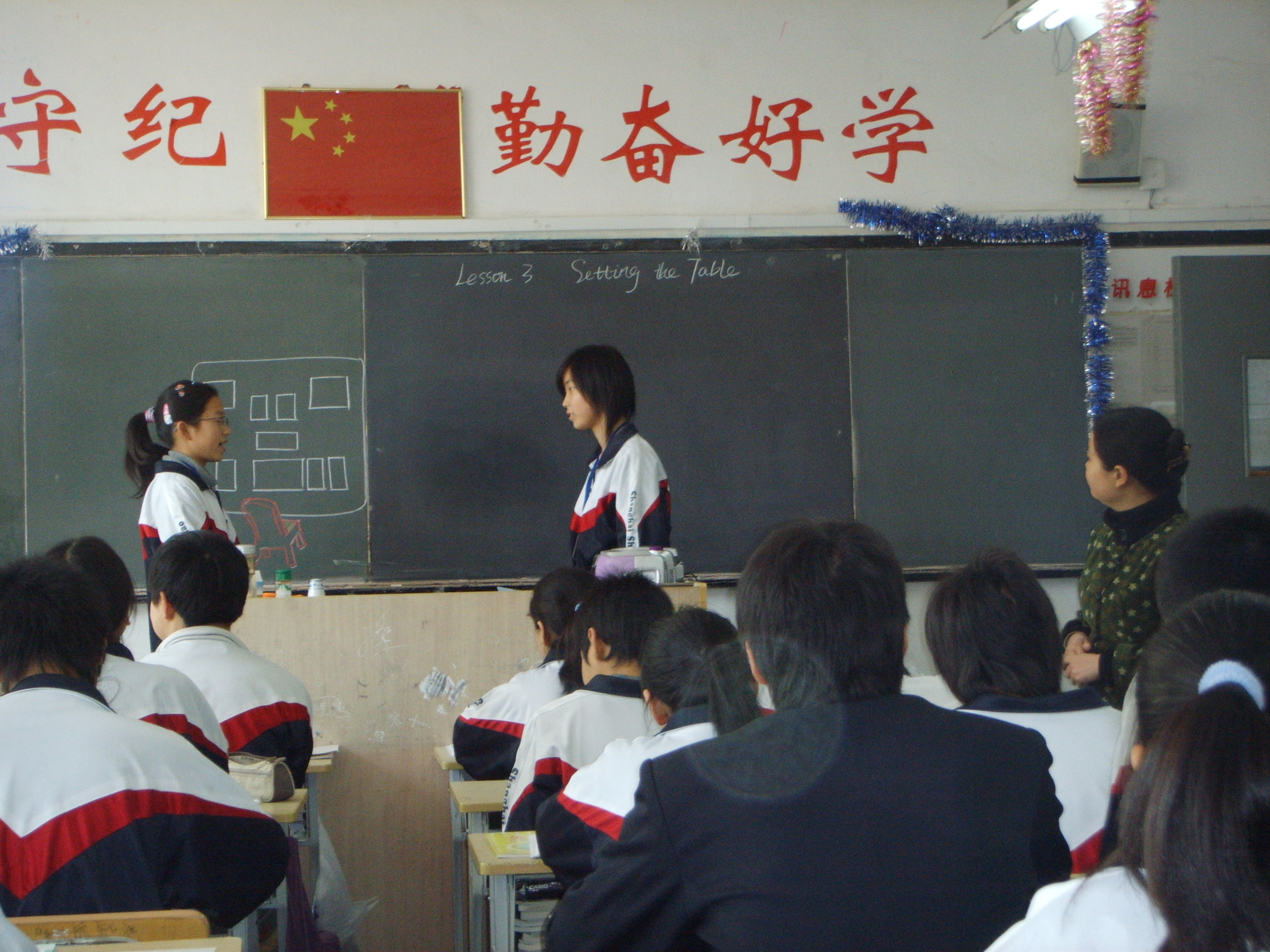 4月3日俞枫教师在061化工(3)的课堂教学可圈可点。本课的教学目的是让学生了解中西餐桌礼仪的差异。她通过实物及图示介绍了西餐中刀、叉、匙及其他调料的摆放位置,使课本知识形象化,变静态的书本知识为动态的教学情景,寓教学于富有情趣的情景中,充分调动了学生的学习积极性。学生在情景中充分享受英语学习的轻松和快乐,不知不觉中学生的口语能力得到了充分的锻炼。