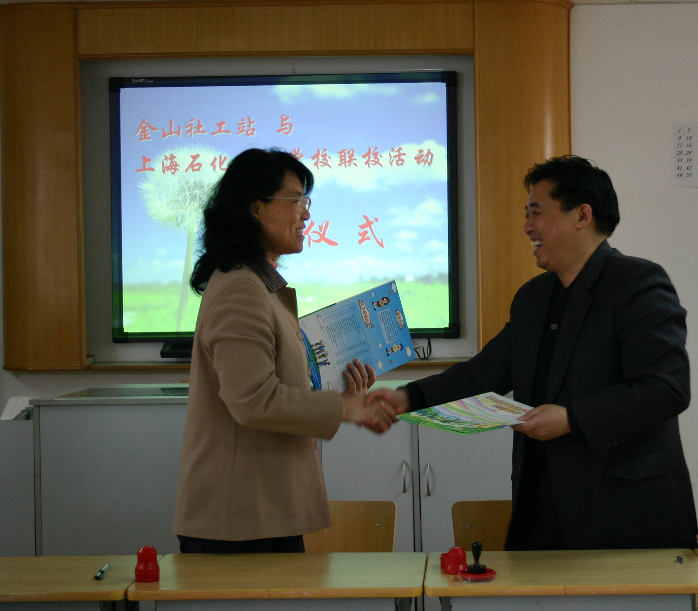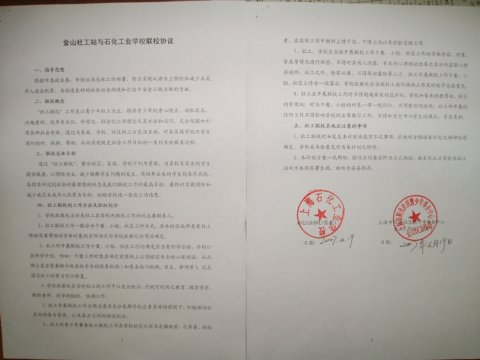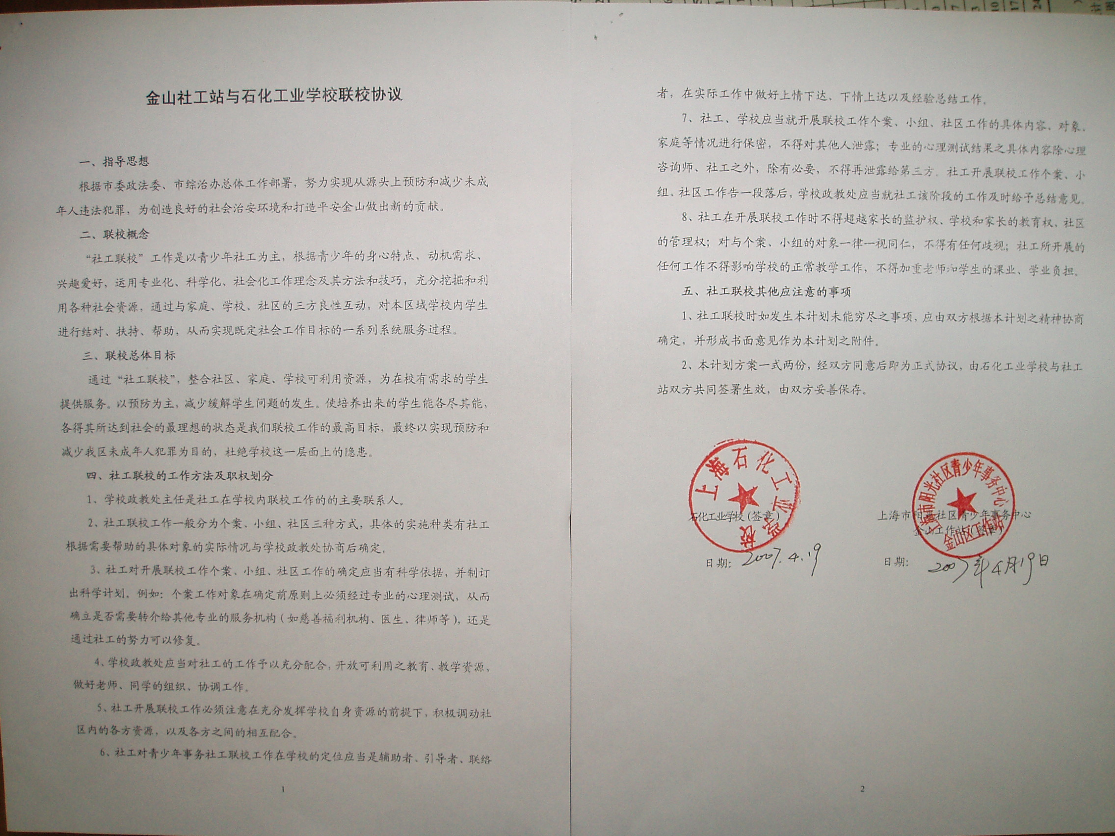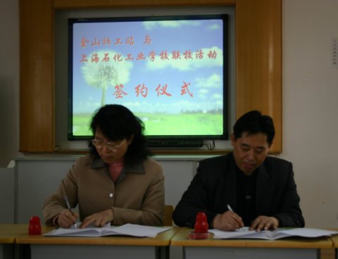 2007年4月19日上午,金山区社工站站长宋彩雯与我校学生处主任唐连喜代表双方单位签署了联校协议,就如何做好社工与学校学生的联系以及如何顺利开展提前介入引导工作进行讨论,并初步确定了实施方案。