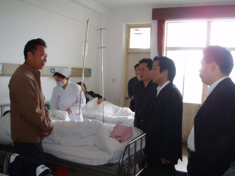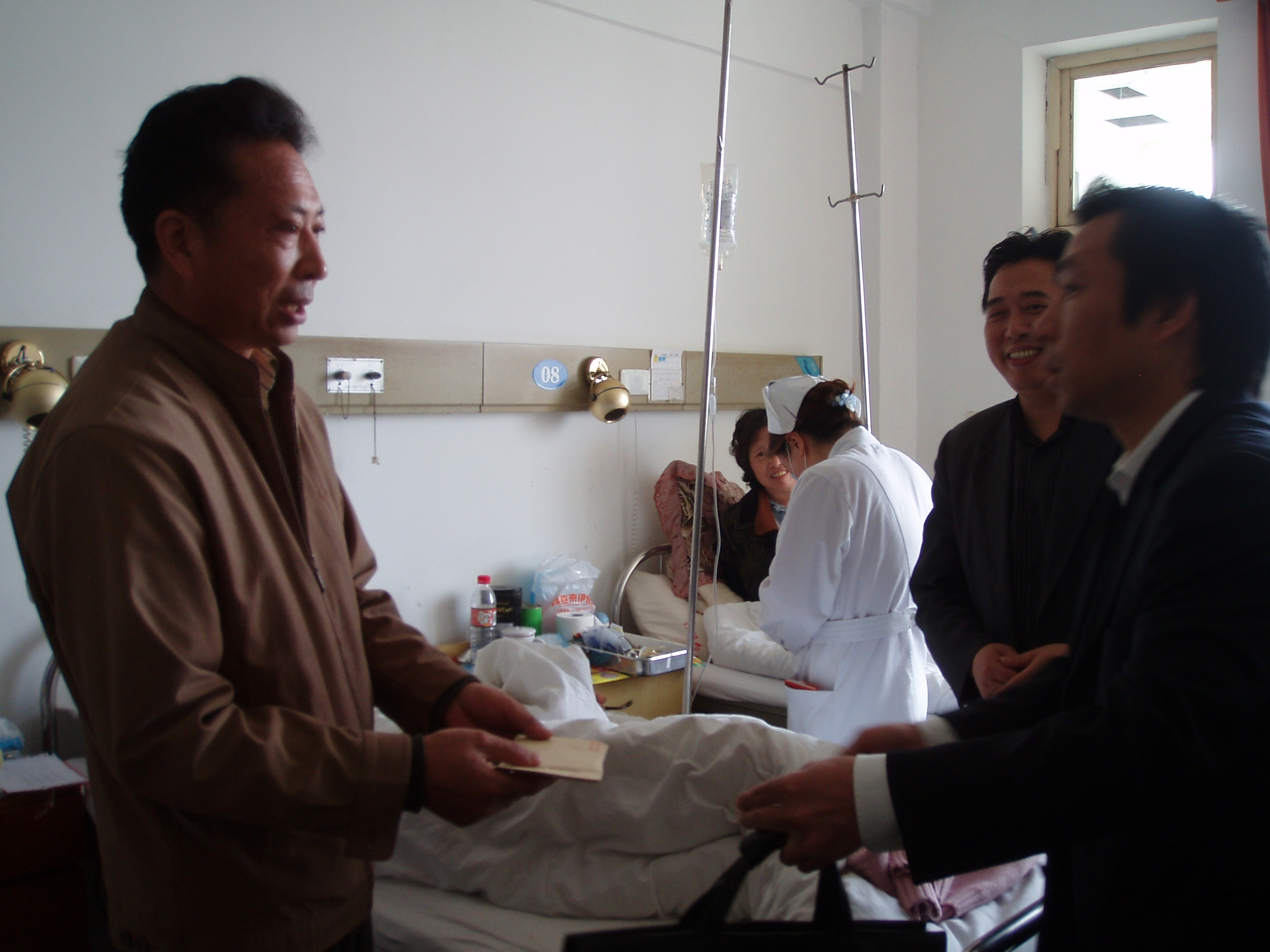 2007年4月28日上午,副校长林国新、学生处主任唐连喜,化工科副科长沈晨阳,团委副书记杨金,姜志强老师一行5人来到金山医院看望我校03级化工科学生赵捷。赵捷同学在2年前不幸换上白血病,现在金山医院接受治疗,学校曾发动学生为赵捷同学捐款,但昂贵的医药费还是让赵捷一家愁眉不展。校领导和学生处领导了解情况之后,前往探望,林国新副校长亲自送上鲜花和第二批6000多元的捐款,并希望赵捷同学好好养病,期盼她能早日回到校园。林校长还特别要求班主任姜志强老师多关心赵捷的情况,虽然赵捷同学不在学校,但学校会一直关心她。赵捷家长也非常感激学校领导和老师的关心。