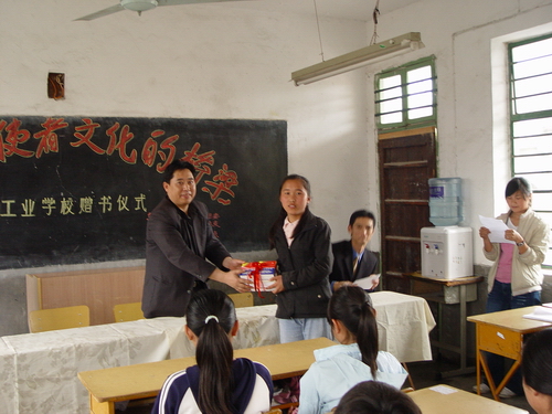 2007年4月28日下午,我校团委与蒙山中学团总支在蒙山中学教学点即民工子弟学校联合举办主题为“友谊的使者,文化的桥梁”石化工业学校捐书仪式。我校学生处主任唐连喜,团委副书记杨金老师带上了我校学生募捐的近3000册书本前往蒙山中学教学点,将这些书籍捐赠给该教学点近200名中小学生。蒙山中学总部张副校长参加了仪式。