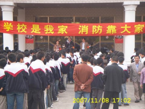 2007年11月8日下午3点30分,我校消防紧急疏散演练在北校区举行。按照演练预案,情况假设第三教学楼由于电线老化引发火灾,瞬时楼道内浓烟弥漫,应急小组教师开始逐层疏散学生,学生在老师的指导下全部有序地撤离出来,整个过程只用了7多分钟,演练非常成功。 通过这次消防演练活动,进一步增强了学生突遇火场的防范意识和应急逃生自救能力,积累了我校火灾应急预案的实际操作的经验。