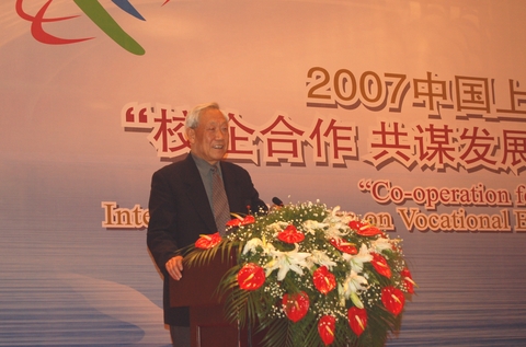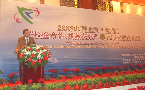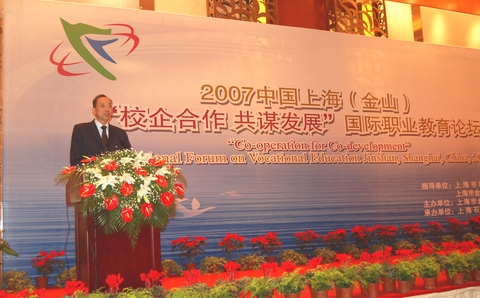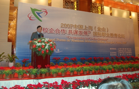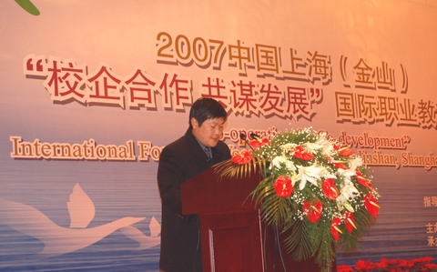 2007年12月12日上午,由上海市教委、金山区人民政府共同指导,金山区教育局主办,上海石化工业学校承办的“2007中国上海(金山)‘校企合作共谋发展’国际职业教育论坛”在金山海鸥大厦隆重举行。上海市教委副主任尹后庆、中共金山区委常委宣传部部长叶汝强、上海化学工业区管委会副主任陈兆麟、上海石化股份有限公司副总经理唐成建、上海市政协教科文卫体委员会常务副主任上海市职教协会会长薛喜民、上海市教委副秘书长张持刚、金山区政协副主席教育局局长徐虹、上海市教委职成教处处长王向群、华谊集团技术经济委员会副主任沈丽萍、中国化工教育协会秘书长任耀生、中华职教社理论研究委员会主任马庆发等政府相关部门及研究机构领导、专家,上海市部分中职学校校长,德国拜耳公司、上海赛科公司、德固赛公司等合作企业的领导和我校领导、部分教师共约100余人出席了本次论坛。