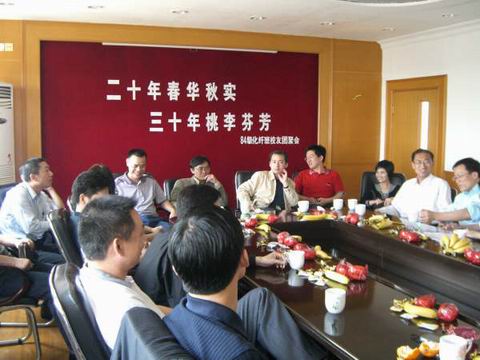 当天下午学校三楼会议室里传来了阵阵欢歌笑语,84级化纤班毕业20周年校友团聚会正在举行。来自祖国各地的校友和老师们久别重逢,欢聚一堂,谈笑风生,嘘寒问暖,纷纷叙说对生活的感叹,对过去岁月的怀念。原以为生活的沉淀,时光的流逝,使年近四十的毕业生们激情不再。然而,当他们毕业二十年后重新看到了美丽和谐并充满巨大变化的校园、看到敬爱的老师和亲爱的同学们的时候,心情难以言表。当年那段年青的时光,曾经一起学习生活,朝夕相处,甚至形影不离的岁月,此时想起来都是多么难忘而美好的回忆。“今天我们回来了,是因为:老师我想你!同学我想你!学校我想你!”