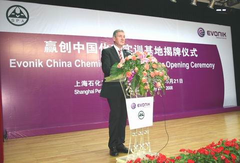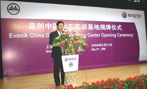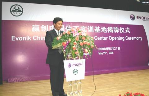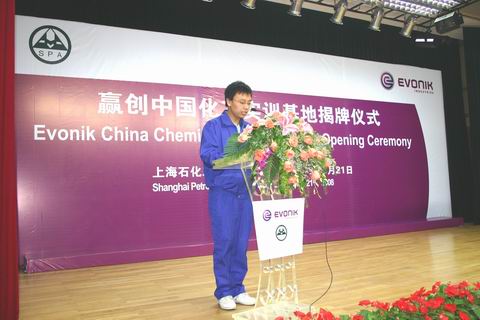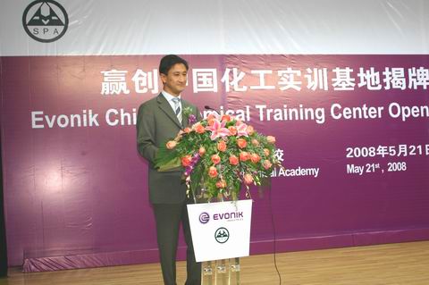 揭牌仪式由赢创德固赛(中国)投资有限公司周雯怡主持。上海石化工业学校校长苏勇首先致欢迎辞,他向出席揭牌仪式的嘉宾表示热烈欢迎,并向赢创德固赛多年来给予我校的大力支持表示衷心的感谢,他说,自2005年至今的近三年时间里,我校与赢创德固赛(中国)投资有限公司在职业教育与培训方面开展了卓有成效的合作。“赢创中国化工实训基地”正式挂牌成立,标志着我校与世界一流企业在职业培训领域的合作进入一个新的阶段。这种跨区域、全方位的职业培训的合作,不仅能够为赢创在中国的独资和合资企业公司提供优质的员工培训服务,而且将会直接推动学校的快速发展。