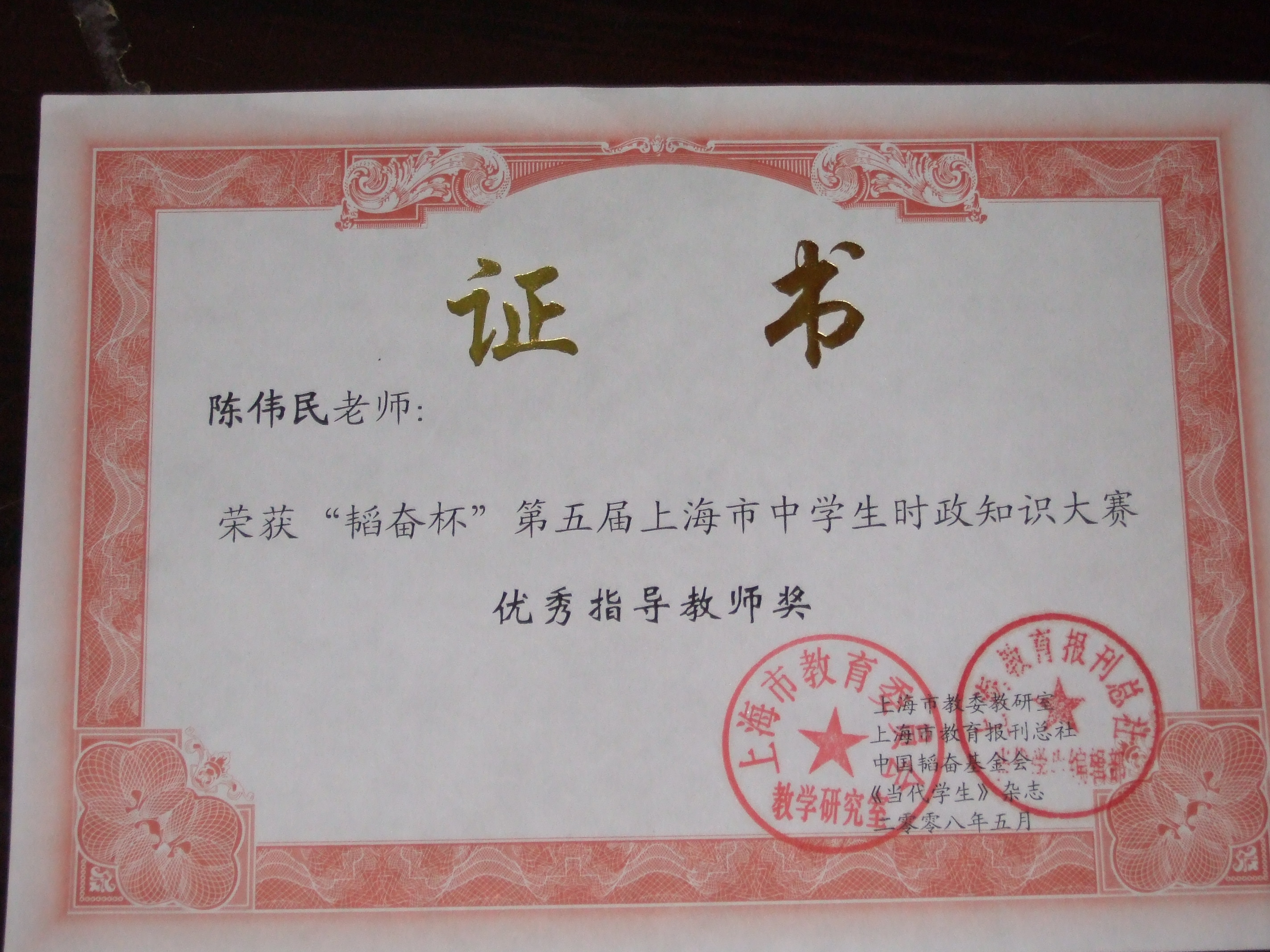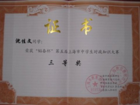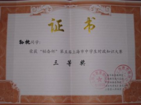 日前,“韬奋杯”第五届上海市中学生时政知识大赛圆满结束,我校荣获优秀组织奖;陈伟民老师荣获优秀指导教师奖;我校学生沈佳文(051化工2班)、孙枕(061电子1)荣获三等奖。