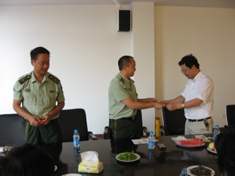 为了进一步促进学校精神文明建设,更深入地开展民拥军、军爱民、互帮互学、共建共益的军民共建活动,在“八•一”前夕的7月26日下午,苏勇校长率领学校党、政、工领导班子赴上海市武警总队第五支队二大队对冒着酷暑坚守战斗岗位的武警官兵进行了慰问,并送去了慰问品。同时对如何更进一步加深军民鱼水情、学校与部队的关系,进行了深入探讨。会谈后,武警上海市总队第五支队二大队教导员徐新波还带校领导班子参观了营区宿舍、营区监控系统等。