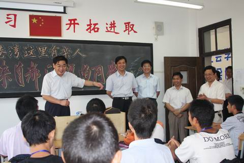 上午9点,吴书记一行来到学校南区机电教学楼,走进081机电8班与同学们亲切交谈。吴书记先向同学们简单介绍了金山区的人文、地理,介绍了四川汶川大地震后金山区对灾区的支援情况。吴书记说,我们要积极响应党中央的号召,一手抓支援灾区重建,一手抓社会经济建设。灾区重建需要艰巨而漫长的努力,同学们来上海金山学习,努力学好本领,将来可以更好地投身于家乡的建设之中。吴书记仔细询问同学们在生活学习中还有什么困难,有没有打电话给亲人?嘱咐同学们要好好珍惜学习的机会,使这三年学习成为人生中最宝贵的一段经历。来自都江堰市的唐梓翰同学回答了吴书记的询问,表示他们在这里生活得很好。最后同学们合唱了一首《感恩的心》,表达了33名同学共同的心声: