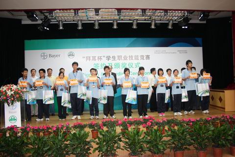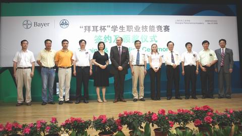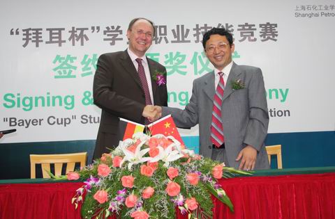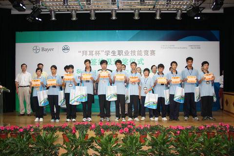 2002年6月,上海石化工业学校和拜耳正式签署了合作协议,启动了“拜耳(中国)实训基地”的建设,组建了第一届拜耳班。6年多来,双方在职业教育与培训开展了全方位的合作,包括同共制定教学计划,共同选定、编写教材,共同实施教育教学和实训计划,共同培养师资等。在此期间,双方共招募学生组成了8个“拜耳”班,共有285名学生接受校企双方的合作培养。2008年,双方进一步拓展与深化合作办学形式和内涵,决定连续三届联合举办以 “拜耳”冠名的学生职业技能大赛,拜耳公司为竞赛提供奖励资金。从今年5月开始举办的首届“拜耳杯”职业技能竞赛,得到了全校师生的热情响应,全校有1992名学生的报名,到6月底竞赛圆满结束。