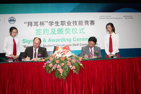 2008年9月23日,上海石化工业学校B区报告厅隆重举行“拜耳杯”学生职业技能竞赛签约仪式暨首届“拜耳杯”职业技能竞赛颁奖仪式。上海市教委、上海市劳动和社会保障局、金山区人民政府、金山区教育局、金山区劳动和社会保障局、上海市化学工业区、拜耳一体化基地等政府相关部门及企业领导出席了仪式,上海石化工业学校领导及部分学生也出席了本次仪式。