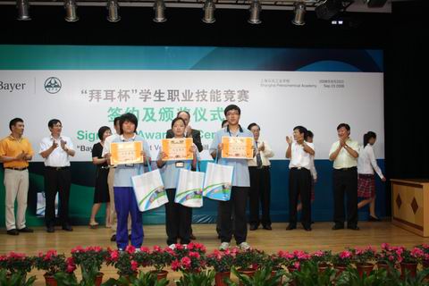 上海石化工业学校校长助理高炬在大会上宣布了先进集体和先进个人名单。首届“拜耳杯”职业技能竞赛有1300人次的学生参加, 64人获得一等奖,128人获得二等奖,190人获得三等奖;051化工(2)班、061电子(1)班、061物流(1)班获得技能竞赛先进集体。