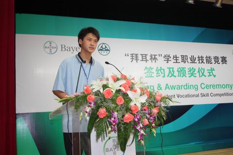 最后,获奖学生代表拜耳班学生马晓超发言,他对拜耳的培养和教育表示感谢,并表明了今后奋发学习、为拜耳贡献力量的决心。仪式结束后,与会领导和获奖学生合影留念,金山区教育局局长蒋志明、上海石化工业学校校长苏勇以及获奖学生分别接受上海市教育电视台的采访。