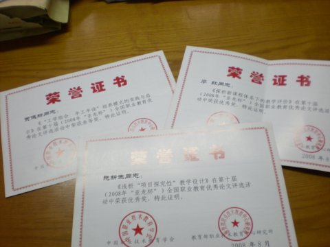 贾佩新老师的《“工学结合,半工半读”培养模式的实践与启示》荣获三等奖;施新生老师的《浅析“项目探究性”教学设计》与廖红老师的《探析新课程体系下的教学评价》均荣获优秀奖;同时我校在此次全国职业教育优秀论文评选活动中荣获组织奖。