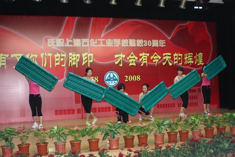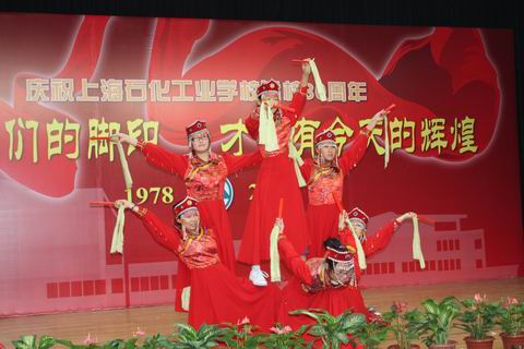 精心准备的校庆文艺演出把庆祝活动推向高潮。学校教师的集体诗朗诵“生日快乐――上海石化工业学校”拉开了演出的序幕,教师们以雄浑之声颂出了在校庆之际对学校的深厚感情和美好祝愿。学生自编的健身联舞《青春旋律》一上台就博得满场喝彩,律动的节奏,矫健的身姿,展示了我校学生蓬勃的活力和不懈进取的精神。我校海拉尔班极富民族特色的筷子舞《欢歌》欢快奔放,激起了在座教师的热情。快板《校园颂》表达了希望母校欣欣向荣,桃李满园的美好祝愿。集体舞《青春风采》将气氛推上又一个高潮,欢快的舞步、优美的旋律演绎着如今石化工业学校人的激越,飞扬的歌声吟唱着难忘的岁月。幽默诙谐的小品《卖假证》引发了台下阵阵笑声,欢歌笑语中新老上海石化工业学校人齐聚一堂,共同为学校的生日祝福,学术报告厅里回荡恒久不变的真切。