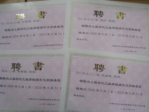 会上,推普员代表上台领取自己的聘书。首次受聘的推普员有58名。聘期为2008年9月1日―2010年8月31日。071环保班李依文同学作为推普员代表上台发言。她表示要积极发挥推普员作用,履行推普员职责,说标准普通话,写规范字,真正起到推普员的作用。接着,李平清副校长给我们的推普员做动员。李副校长对在座的同学能成为学校语言文字推普员表示祝贺。希望我们的推普员以身作则,起好示范带头作用。明确责任,带领同学一起参加语言文字活动,并积极争创优秀推普员,从自己的角度出发,为学校的语言文字工作提建设性的意见。最后由