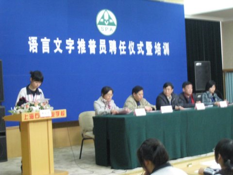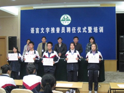 在11月份,由教务处、团委牵头,在全校07、08级同学中招募语言文字推普员。通过学生自荐、班主任推荐,形成了班班有推普员的机制。我校现在是区级语言文字规范化示范校。学校大力推进普及普通话和社会用字规范化,形成我校语言文字工作的长效机制,在新一轮创建活动中,争创上海市语言文字规范化示范校。