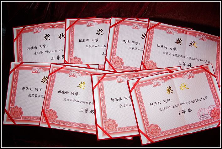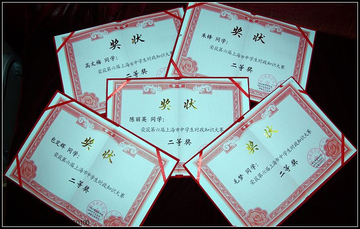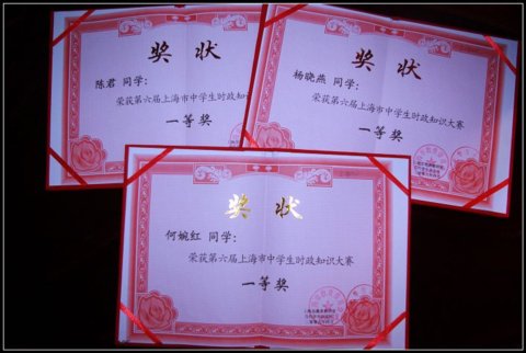 4月26日上午,第六届上海市中学生时政知识大赛颁奖仪式在上海图书馆二楼报告厅举行,我校16名获奖学生参加会议。事后,一等奖得主陈君感慨地表示:我们体验到了成功的喜悦,我们也看到了新的希望!我们相信,只要坚定自己的信念,就能找到正确的方向,只要认准方向,就能坚定前进的步伐。