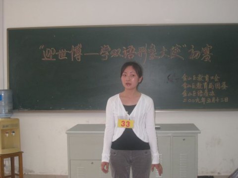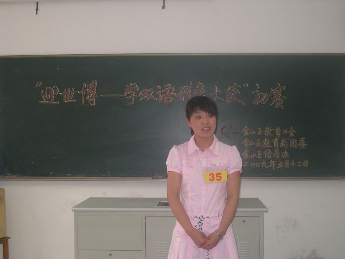2009年5月12日下午,在金山区教师进修学院106教室举行了由金山区教育工会、金山区语委办、金山区教育局团委联合举办的“迎世博――双语形象大使”评选活动初赛。我校三名青年教师严小丽、寻桂玲、曹律参加了本次评选活动。