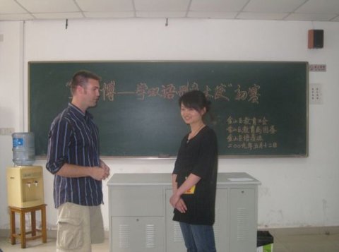 经过4月23日的统一培训后,三名青年教师分头准备比赛。初赛分三个环节。首先是半分钟到一分钟的英语自我介绍,然后是三道关于世博的知识题,可用中文回答。最后是情节对话。在一个设定的环境下,与外教直接对话。