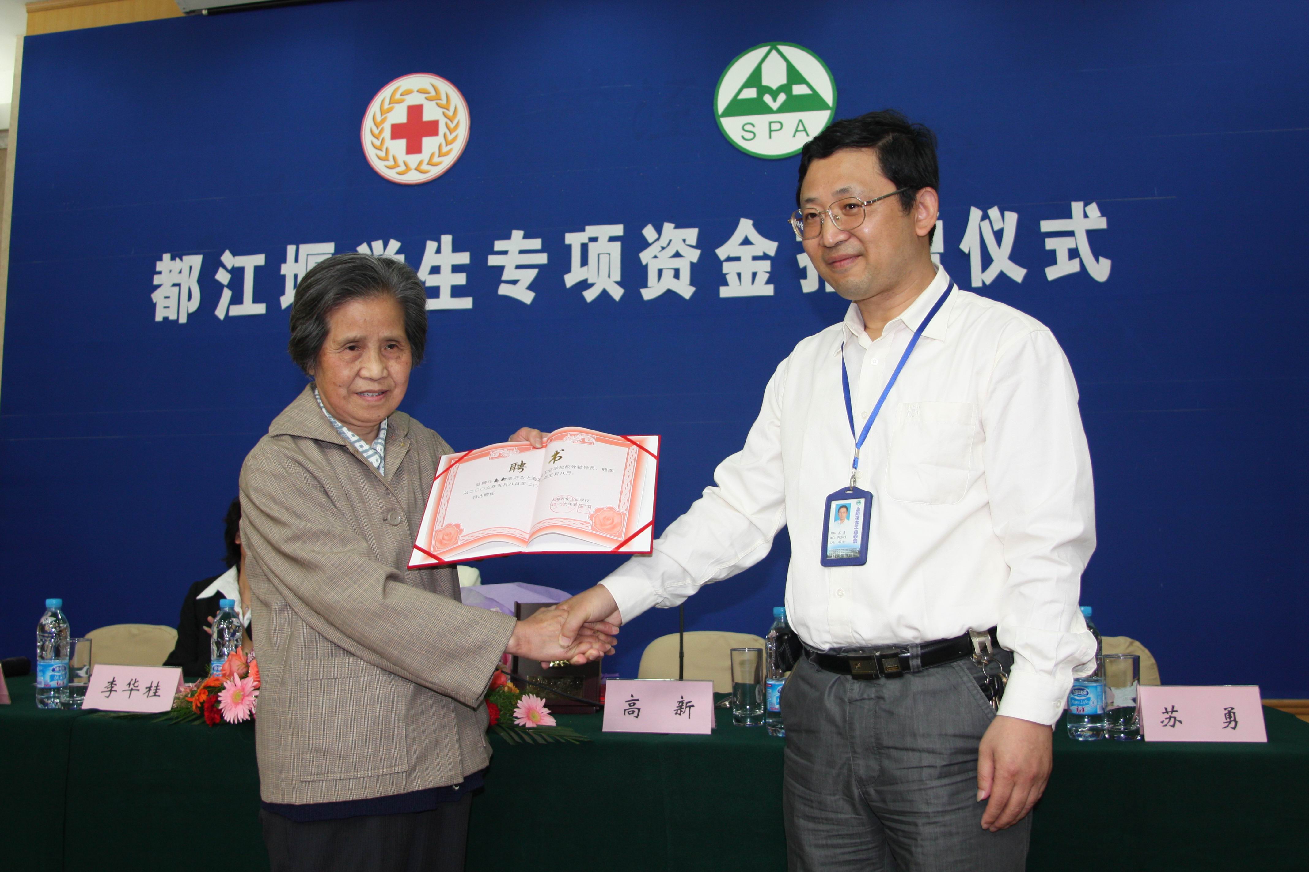 会上,由金山区副区长、区红十字会会长李华桂向高新老师颁发了红十字会奖状和证书。并且,上海石化工业学校苏勇校长向高新老师颁发了校外辅导员聘书。