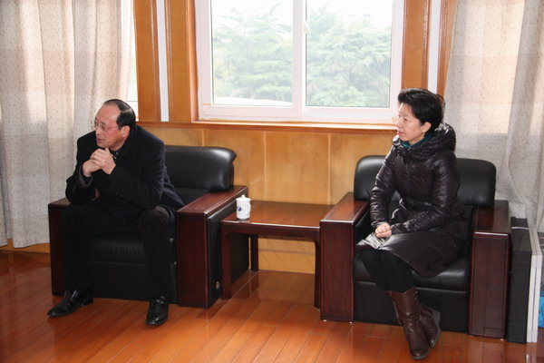 在学校办公楼大厅,陈部长向苏勇校长送上了鲜花,并致以亲切的慰问和新年的祝福。随后,一行人来到校长办公室接待室。陈部长询问了学校建设发展情况,特别对正在建设的综合实训大楼的工作进展情况进行了了解,问学校还有没有什么困难。苏校长感谢区委、区政府对学校改革建设给予的大力支持,表示工程进展一切顺利,很快就会竣工。谈到人才建设方面的问题,苏校长谈了一些想法和建议,陈部长表示将择时专题讨论。