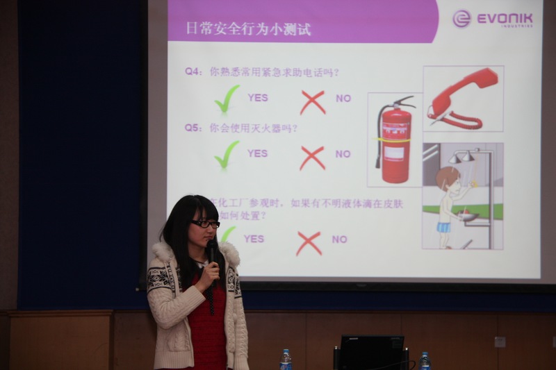 首先由ESHQ部刘骋给我们讲述企业环境保护管理知识,其主要内容有四点:环境管理体系的介绍、三废管理的介绍、厂界噪声管理的介绍和环境实验室管理的介绍。接着Amanda Li 对我们进行了日常安全行为小测试,全班同学兴致高昂,现场气氛一下子热烈起来。同时她还介绍了关于赢创日常安全教育的形式,从装置现场到洗手间,安全标语无处不在,处处体现了赢创对安全的高度重视。
