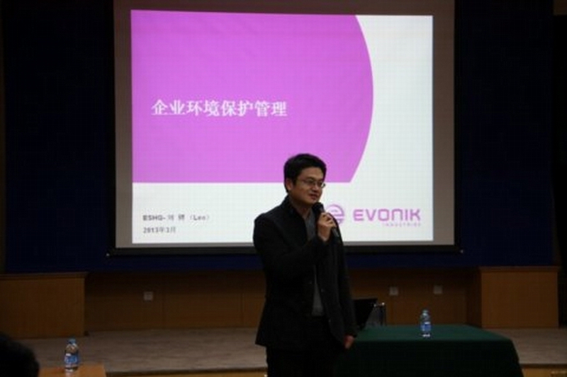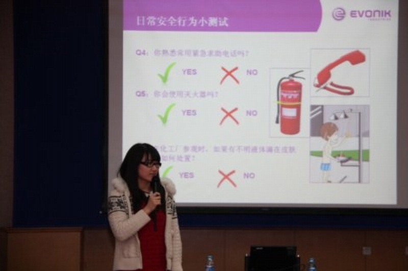 赢创公司此次派出了ESHQ部门刘骋老师、李璐老师,两位老师从事ESHQ工作有将近十年的时间,经验相当丰富。刘骋老师从环境管理体系、三废管理、厂界噪声管理和环境实验室管理四个方面介绍了企业的环境保护管理知识,着重强调了持续改进的指导思想,并再三强调环境保护无小事。李璐老师以企业的人文关怀入手,几个诸如“上下楼梯,你习惯使用扶手吗?驾车时,你习惯系安全带吗?”的问题将现场的气氛调动了起来,同学们参与的兴趣很高,李老师顺势引入赢创中国多用户基地的ESH的培训体系和日常安全教育形式,安全无小事,从现场装置到洗手间,安全标语无处不在,充分体现出安全的重要性。