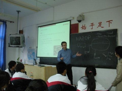 早在学期开始之初,我们便拿到了西萨厂方为我们特地送来的几份课程材料。正式讲课开始之前,Manuel经理简炼地介绍了西萨化工对操作工的管理体系及要求;接着进入本次课的正题,即操作工的主要安全职责,Manuel经理从火形成原因、泵的作业条件、安全材料等12个方面对操作工的安全职责做了详细的阐述,并对一些典型的事故案例加以分析。在Manuel经理讲课的时候,整个教室显得格外安静,同学们聚精会神地聆听他的讲解,而当Manuel经理示意需要同学上台与他进行互动的时候,教室里往往瞬间扬起三四只手臂;当上台的同学回答出正确答案的时候,我们则与Manuel经理一起为他鼓掌。整个教学过程显得轻松而愉快,时间在不知不觉中度过了,3个小时的学习很快就临近了尾声,我们用热烈的掌声感谢Manuel经理细致的讲解以及Miss Julia Guo耐心的翻译。从这堂课中,我们不仅学到了更多的专业知识,还更加体会到了英语在外企的重要性。通过此次教学,我想同学们会更加重视专业英语的学习。我相信有一天,我们也能用流利的外语于世界展示我们的专业与优秀。我相信,通过我们的努力,这一天并不遥远!