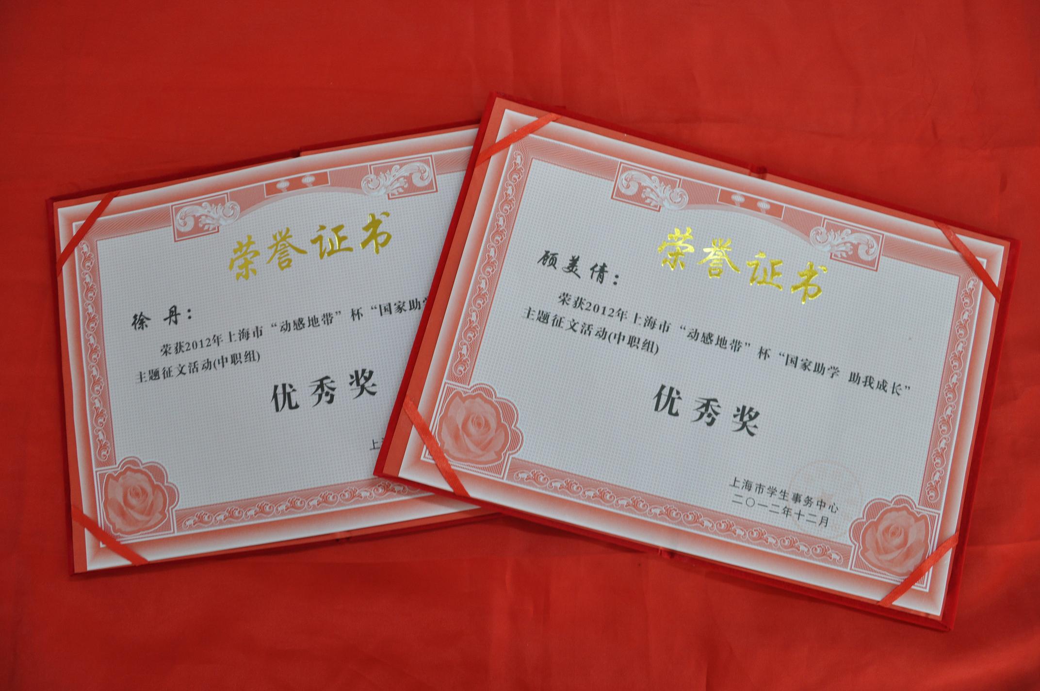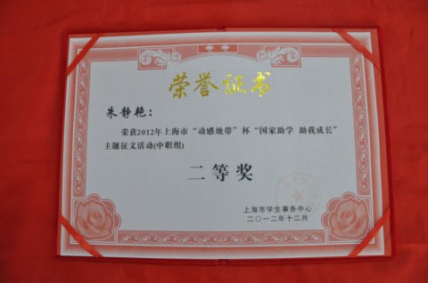 近日,上海市学生事务中心下发“国家资助 助我成长”主题征文活动奖状,由语文老师杨文娟、雷珍指导征文分别荣获二等奖、优秀奖,并被编入上海学生事务中心组织《2012年上海市“动感地带杯”“国家资助 助我成长”主题征文活动》一书。
