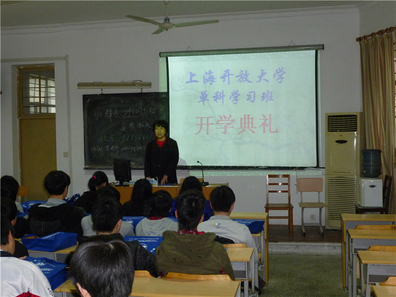 在简朴的开学典礼上,宋老师首先介绍了上海开大课程开放(大专单科学习)模式的特点和要求。上海开大是上海市终身教育学分银行的承建单位和管理中心。它将通过建立学分成果认证和学分累积及制度,搭建起职前教育和职后教育衔接、学历教育与非学历教育沟通、各类优质教育资源汇聚的终身学习“立交桥”。然后就上海开大石化教学点(筹)今年春季学期开设“机电技术应用”、“计算机技术应用”专业公共基础课程(英语I、应用文写作、邓小平理论与“三个代表”重要思想、办公自动化),累积13学分的情况向学生交底。要求学生充分认识开大“宽进严出”、“教考分离”的特点,一定要从行动上端正学习态度,确保上课出勤率;要一步一个脚印修完90学分,如期取得大专毕业证书,早日圆梦。