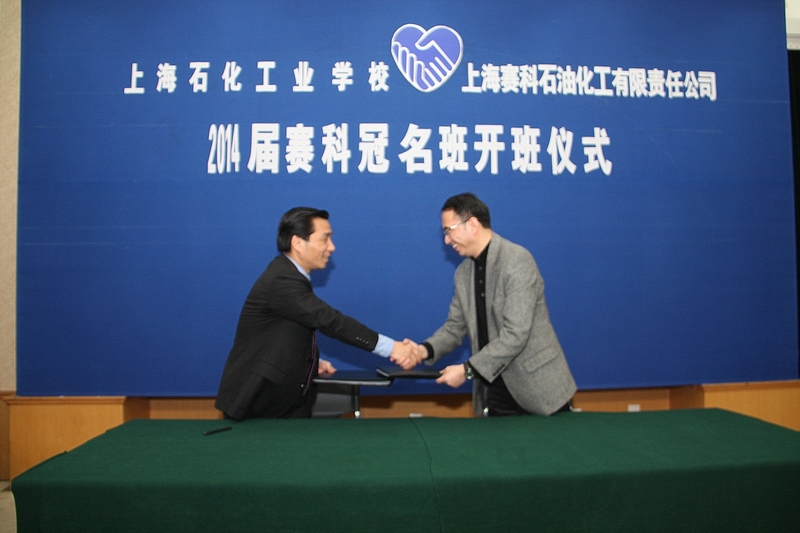 年3月21日下午,我校在B区多功能厅隆重举行2014届赛科班开班仪式暨签约仪式,上海赛科石油化工有限责任公司人力资源部总监王炳育先生、生产部总监Paul Bowdler先生、人力资源部副总监宋莹丽女士、我校08级学生现成为赛科的员工代表张伟伟以及人力资源部的部分工作人员参加了此次签约开班仪式,我校副校长林国新、教务处主任栾承伟、招毕办副主任姜方芳、化工科科长沈晨阳、化工科书记王峥崎、化工科副科长黄祥健、赛科班班主任张鹏以及赛科班的全体同学出席了仪式。仪式由化工科书记王峥崎主持。 上海赛科石油化工有限责任公司是由中国石油化工股份有限公司、中国石化上海石油化工股份有限公司和BP华东投资有限公司共同出资组建的,目前建有8套主要生产装置,具有世界级上下游一体化的特点,其中,设计能力109万吨/年乙烯是目前世界上单线产能最大的乙烯装置之一。公司位于上海化学工业区内,占地约