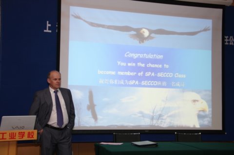 上海赛科生产部总监Paul Bowdler先生随后发言,他是我们上海石化工业学校的老朋友了,从2004年第一届赛科班他就开始了对赛科班学生的培训工作。他介绍了上海赛科的企业文化、企业责任,特别强调赛科最看重HSSE,化工企业员工的安全意识是最重要的。之后他介绍了本届赛科班今年9月份进入赛科后的一系列培训计划,他特别强调同学们必须要认真学习公司提供的各项培训课程,只有符合企业的要求、遵守企业的规章制度、有上进心和团队合作意识并且最终通过各项考核的学员才能成为上海赛科的正式一员,他也相信同学们一定会珍惜此次机会,通过自身的努力一定会有美好的发展前景。