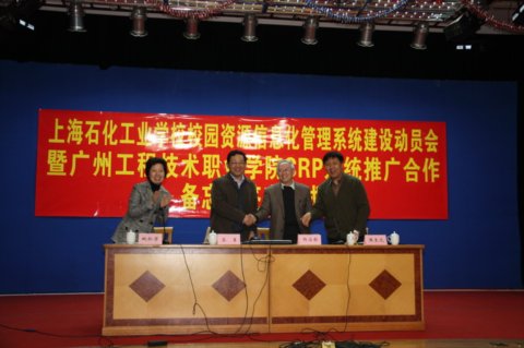 推进校园信息化建设是我校示范校建设的重点项目之一。2013年4月1日,是我校校园信息化建设具有重要意义的一天。上午9点,我校教师们早早地等候在B区报告厅,准备召开上海石化工业学校校园资源信息化管理系统建设动员会暨广州工程技术职业学院CRP系统推广合作备忘录签字仪式。教育部高职院校人才培养工作评估课题组组长杨应崧、广州工程技术职业学院院长樊至光及我校校长苏勇、党委书记姚松芳等出席会议。
