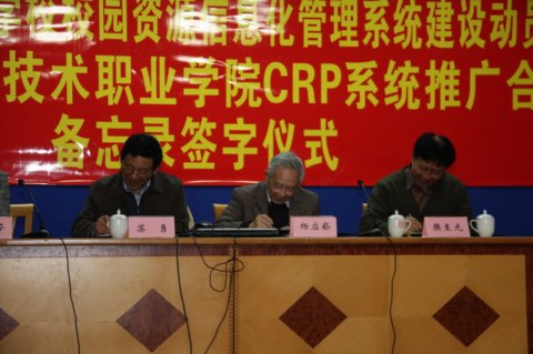 在一阵热烈的掌声后,杨应崧教授、樊至光院长及苏勇校长共同在广州工程技术职业学院CRP系统推广合作备忘录上签字。