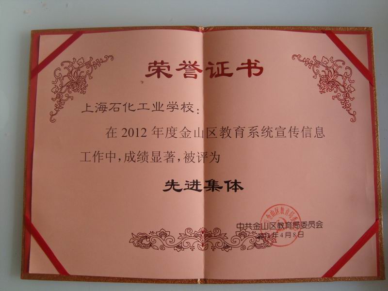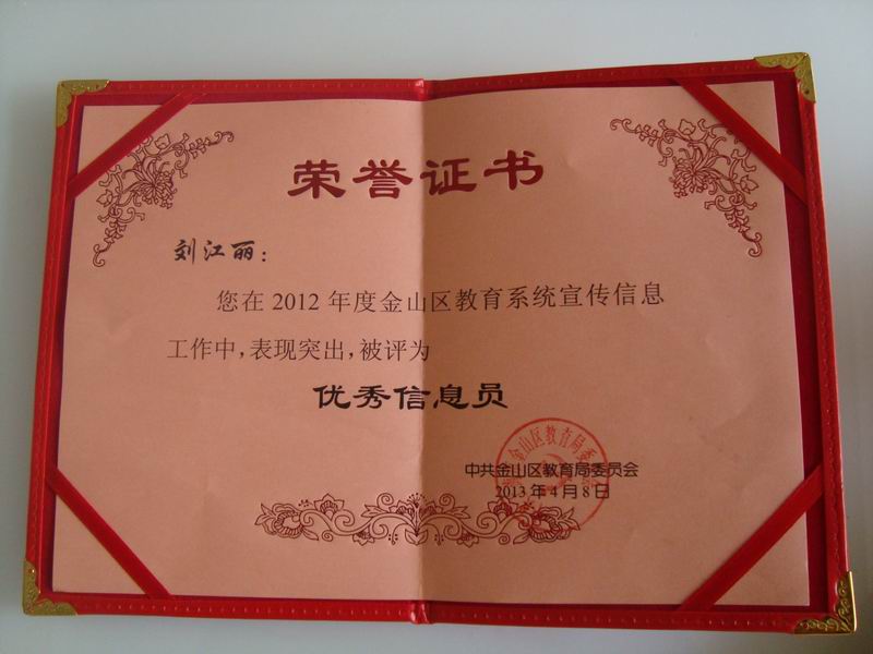 金山区教育局党委副书记韩亚弟对2012年度区教育系统宣传信息工作进行表彰,我校被评为2012年度金山区教育系统宣传信息工作“先进集体”,共有四所学校获得此项荣誉。刘江丽老师被评为“优秀信息员”。