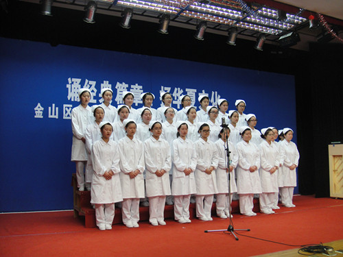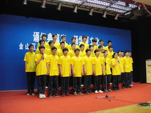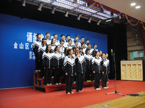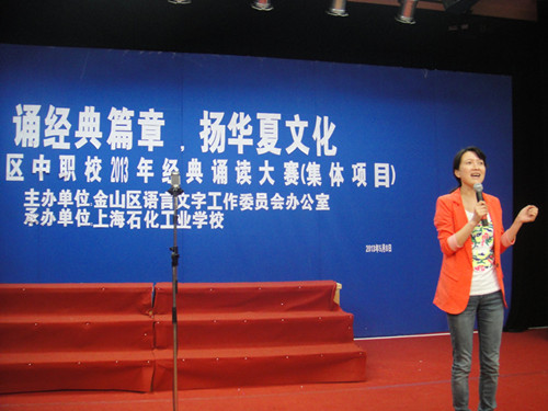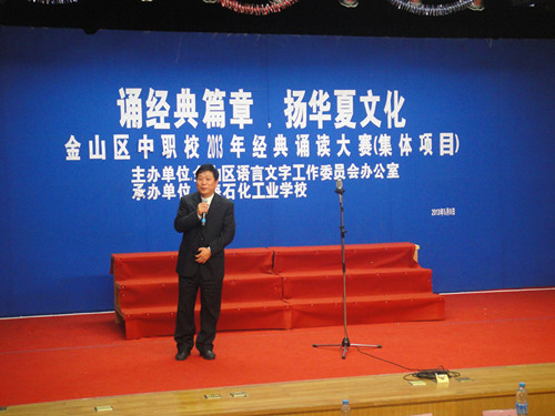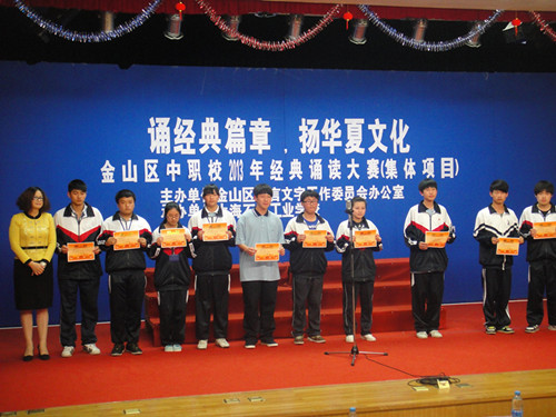 中华传统文化源远流长,五千年的悠久历史孕育了深厚的诗文底蕴,其中凝聚的语言艺术以及中华民族的传统美德,值得我们代代传承。在金山区语委的组织下,我校联合食品科技学校和金山卫校,携手为祖国母亲奉献了一场试听饕餮盛宴。5月8日14:00分,“诵经典篇目,扬华夏文化”金山区中职校2013年经典诵读大赛在我校B区报告厅拉开精彩帷幕。本次大赛共分个人和集体两个项目。上海市语测中心主任徐民杰、副主任朱青春以及金山区的各位语言专家出席大赛并担当评委。