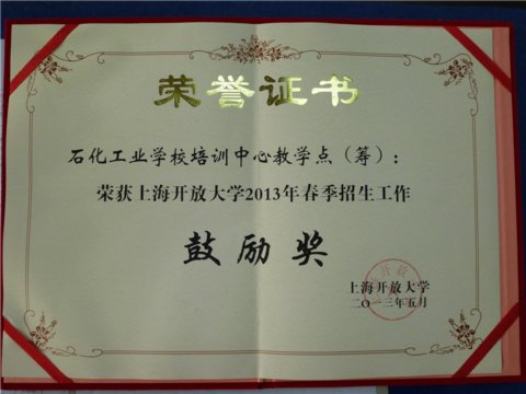 日前,从“上海开放大学2013年春季招生总结表彰会暨秋季招生启动会”上获悉,我校培训中心荣获“上海开放大学2013年春季招生工作鼓励奖”,获此奖项表明“上海开大石化工业学校培训中心教学点(筹)”的招生工作有了良好的开端。