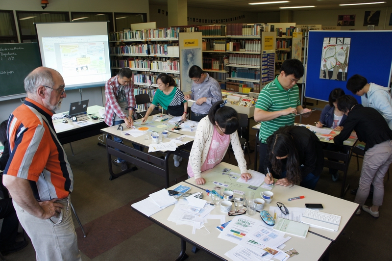 此后,Zeitler老师又从神经细胞理论介绍了成功学习的基本要素――专业预备知识、学生的聪明、学习动力、学习策略等方面进行了讨论,并从长期的实验研究中给出了关于“学习”教学组织新模式,建议避免采用集体学习为主导的学习方式。 为让培训小组的老师们对新的教学模式有感性认识,Zeitler老师采用活动的形式对“先行组织者”教学模式加以解释,活动结果展示了成功的先行组织者的组成要素,即:(1)课程内容应减至最重要的部分,剩下中心的概念和要素;(2)先行组织者以学习卡片 形式指出概念上的关联;(3)具有可以连接学生前期知识的结合点;(4)课堂内容结构不是直线型;(5)课堂内容目视化;(6)课堂组织结构清晰。