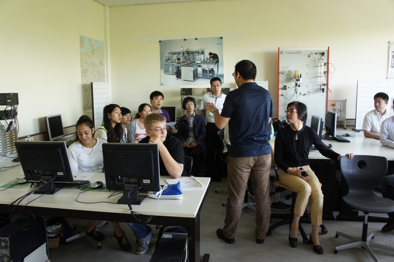 校长Petra Christiansen为大家介绍了学校概况、专业方向及德国双元制教学模式。接着Oliver带领大家参观了学校的教学设施,并观摩了一堂关于“化工自动化控制”的教学公开课。公开课的主要内容是学生根据工艺要求配制浓度为10%的硫酸溶液,要求学生会编写PLC程序并自动控制硫酸和水的进料、配比及混合过程。该课程综合性较强,学生首先要计量配比、熟悉进料和混合的工艺流程,并会用PLC语言编写程序、实现自动控制。整个教学过程,教师引导、学生主导完成计量计算和程序编写设计,每位同学利用计算机完成程序的编写并进行仿真调试,确认无误后编译下载到装置上实际运行。该堂课让我们感受深刻,教学设计通过生产实例将分散的知识点综合联系了起来并真正锻炼了每个学生动手实践能力,教学效果好,课堂气氛活跃。课后,任课老师与培训小组成员就“化工自动化控制”课程进行了细致的交流,介绍了丽莎学校对该门课程的具体设置情况,并简单说明了模块设置的相关内容,这对我校将来开设该门课程有很好的借鉴作用。