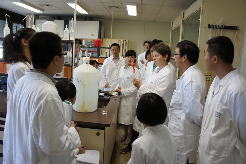 在丽莎学校我们观摩了德国学生上分析课、做实验的过程。丽莎学校的一些仪器设备与我校有些不同,他们的仪器设备更为先进。例如,我们用的洗耳球只有一个吸气孔,而他们的洗耳球有三个阀,虽然在外形上似乎复杂些,但是经过老师的指点后很快学会了使用方法。用这种洗耳球控制液体的流量更方便,易于掌控。另外,他们的移液管,也设计得别出心裁。在使用时,已经为使用者设定好了用量,只要轻轻一倒,把液体注入移液管的管中,可以自动定量液体体积,之后便可以放心地倒出来,既方便、准确,又特别安全。