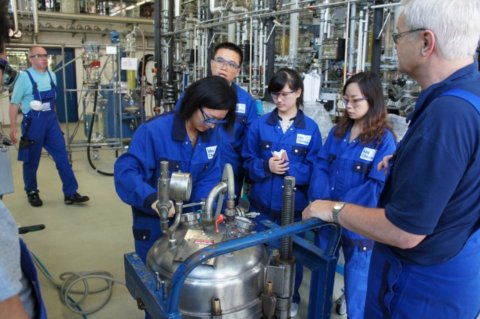在操作现场,更加突出了个人安全的重要性。每次进入中试车间都要全副武装,一条深蓝色背带裤、一件外套、一副防护眼镜和一副手套,有时候还要防尘口罩,甚至防尘衣。每次开始实验时,老师都先带我们去阅读危险化学品使用手册,通过这个环节,让我们在接下去的实验中,了解相应的防护措施以及安全处理方案。当实验结束时,我们都要把仪器设备归位清洁,不仅是为了保证实验场所安全运转、环境整洁清爽,更是为了防止他人误用。工作服厚而重,在这个炎热的天气,令我们感觉密不透风。一节课结束,我们已经汗流浃背。但是,我们知道这是对自身安全的基本保证,也是必须遵守的安全守则。
