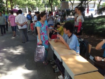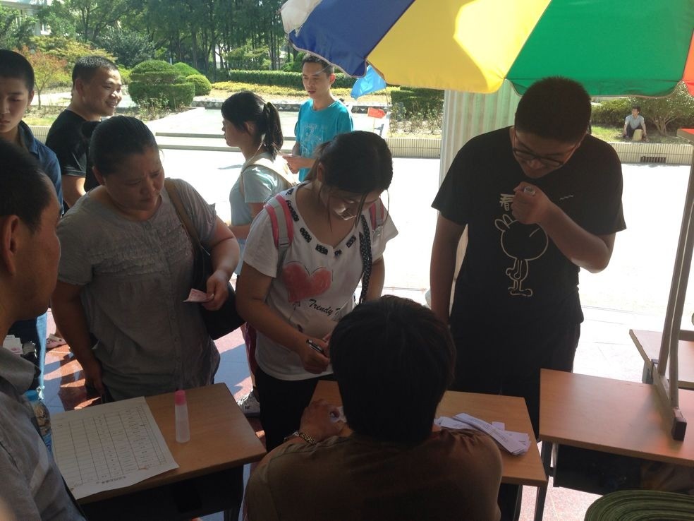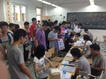 上午7点30,新生报到工作开始。新生按照领取序号、报告厅等候、到班主任处报到、领取军训服装等流程有条不紊地办理入学报到手续。虽然天气炎热,但各个工作点的教师都认真负责、工作严谨。活跃在校园内的志愿者同学指引新生报到,帮助新生和家长拿行李,耐心回答他们提出的各种问题。所有工作人员亲切友善的工作态度和严谨细致的服务质量,给新生及家长们留下了深刻的印象。