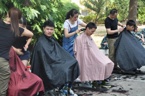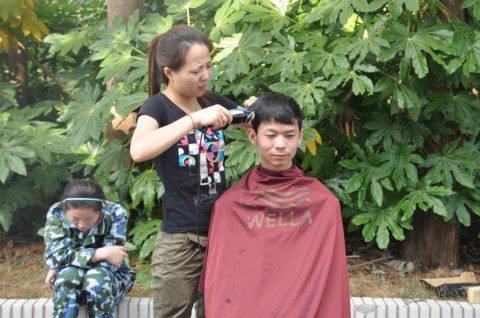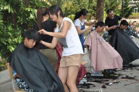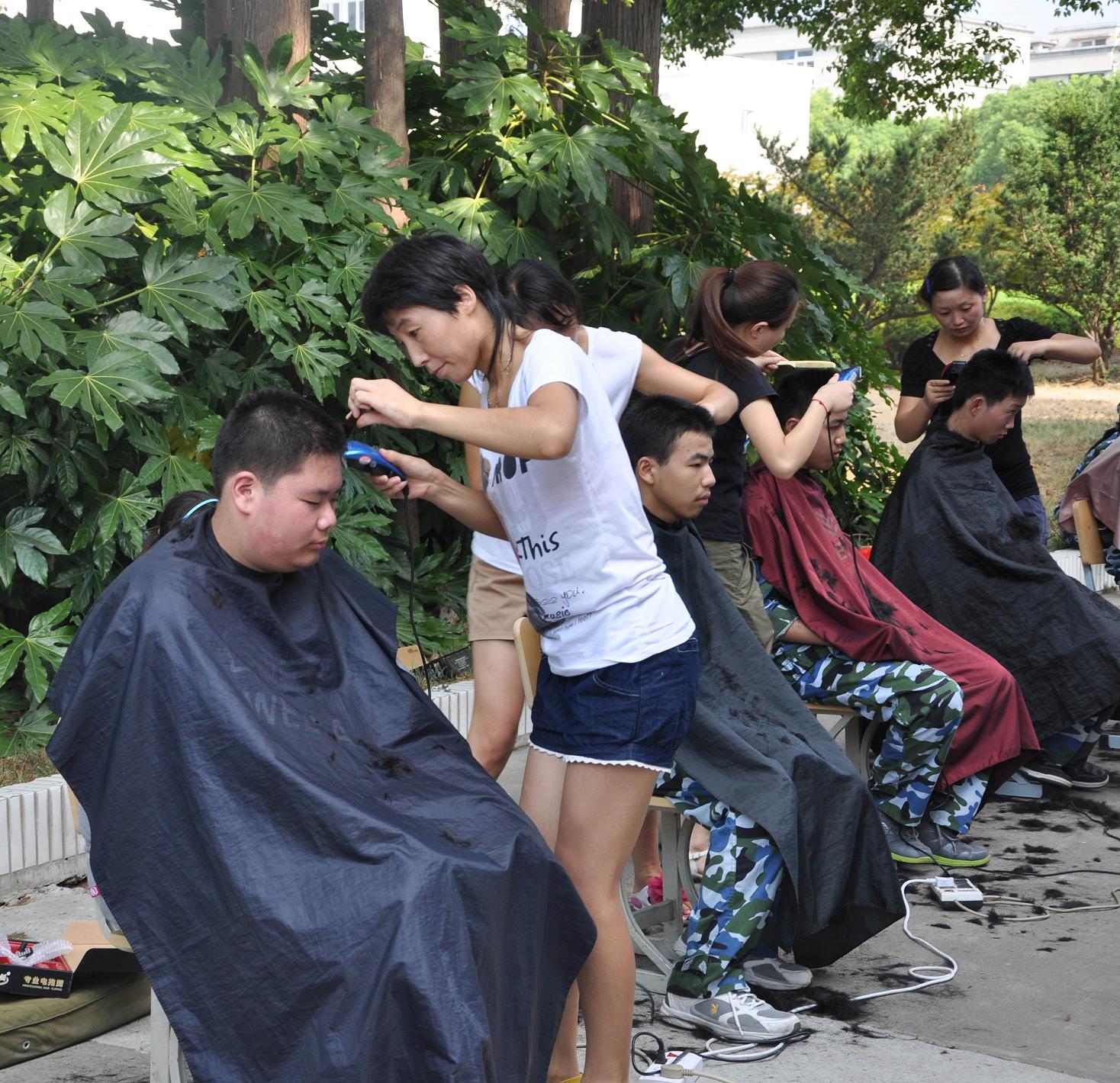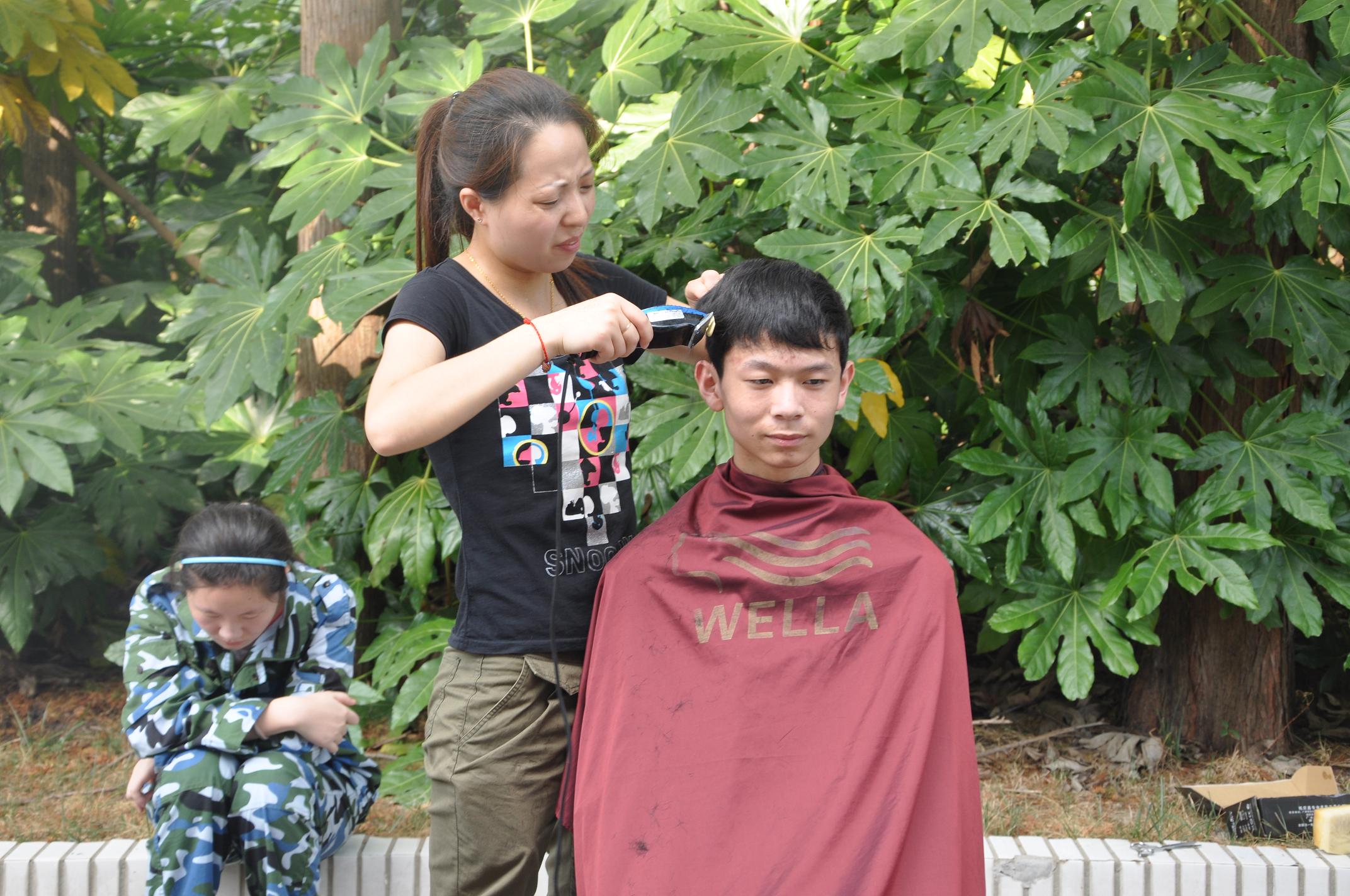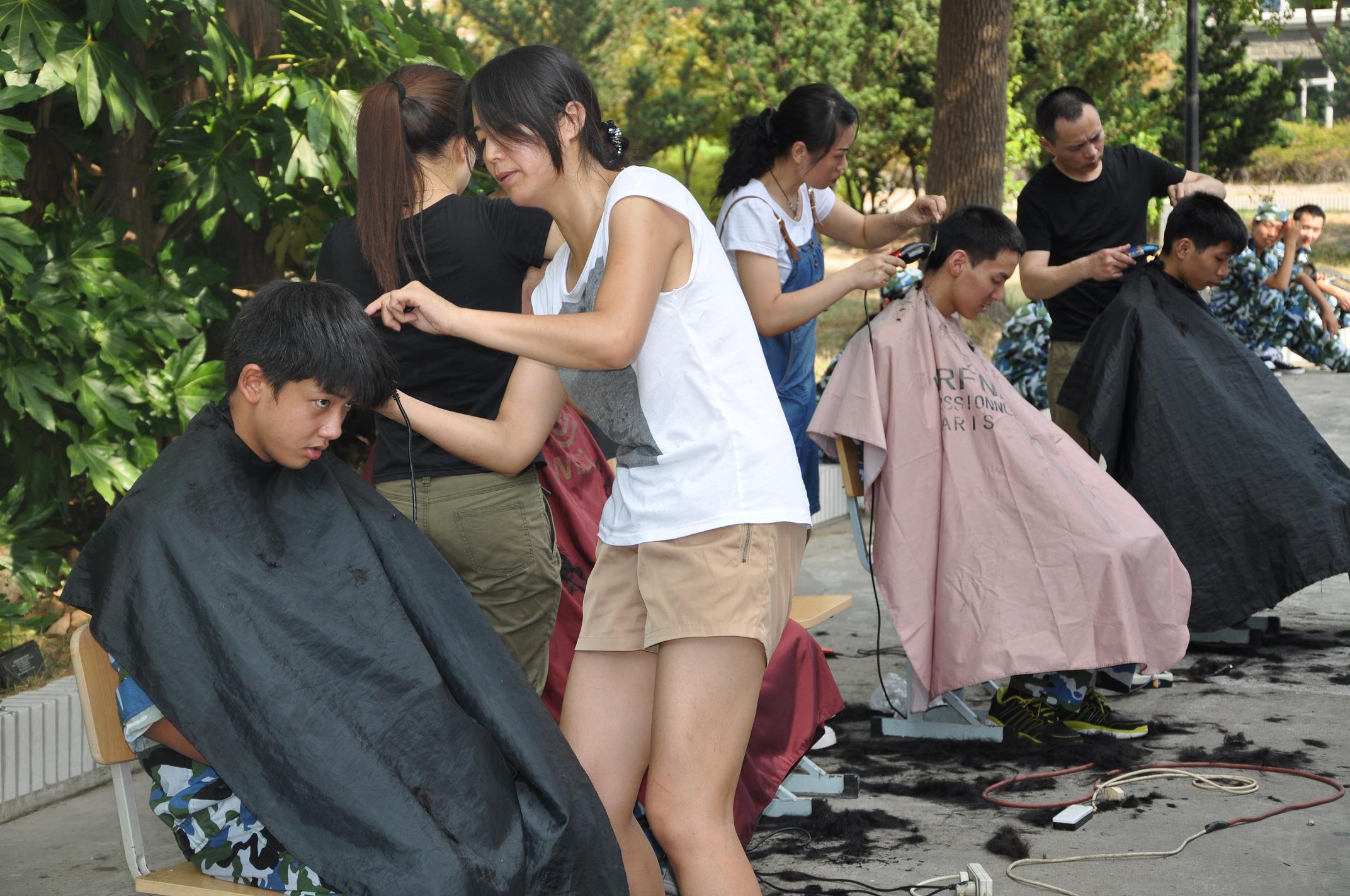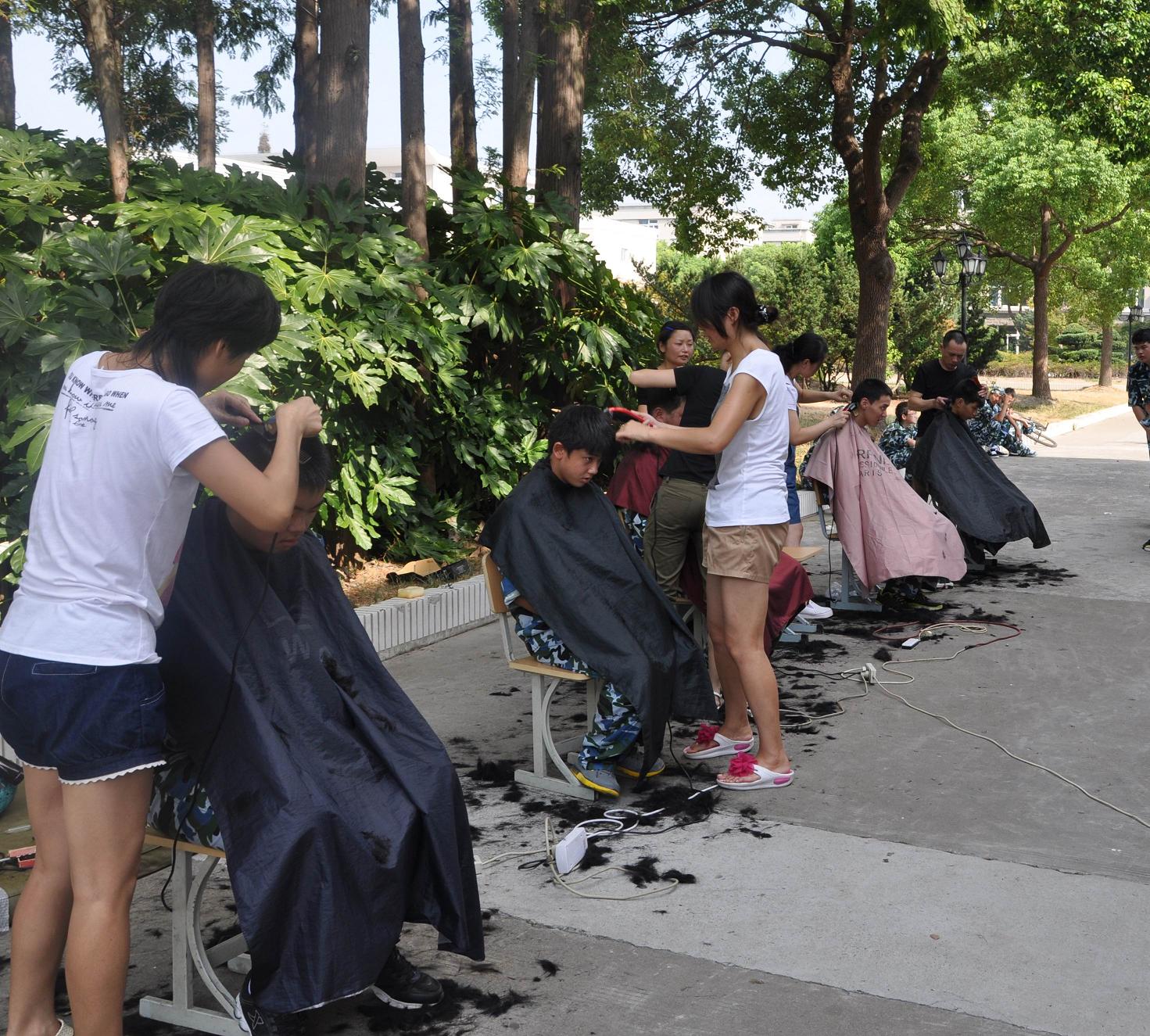 军训期间,根据学校抓礼仪教育、创文明校风要求,从行为规范做起,以整治学生仪容仪表为突破口。8月25日,四位理发师分别在南北两校区设摊理发。针对男同学头发前遮眉,侧遮耳,后遮领等不符合中职生行为规范,统一集中进行发型整治,