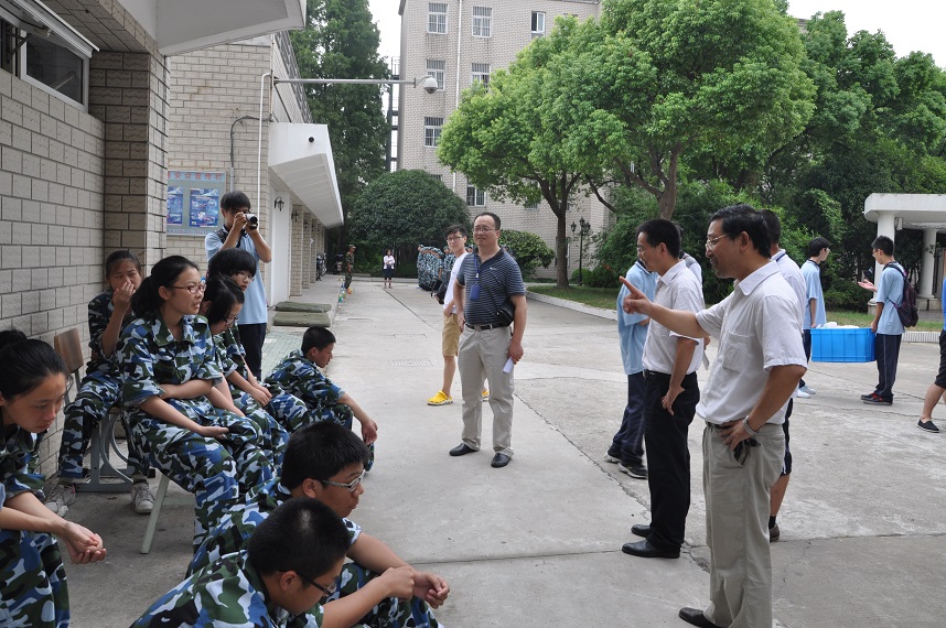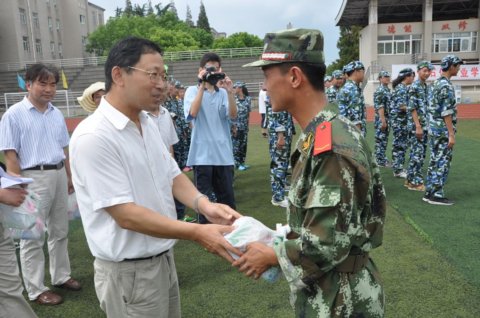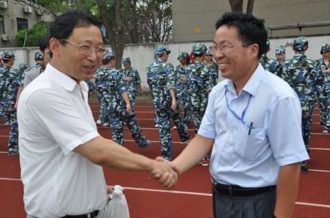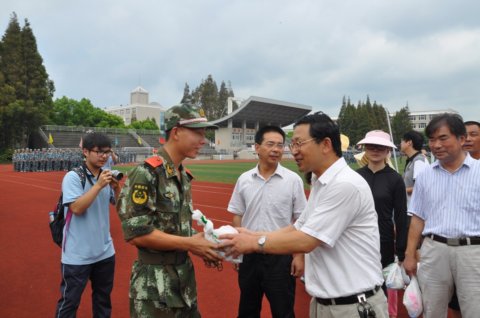 走进军训场地,看着正在烈日下一队队训练的新生,苏校长很欣慰,不时向高炬副校长和迮育彪主任询问训练情况。随后苏校长一行走进训练场,主动热情地与每位