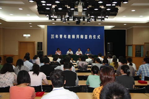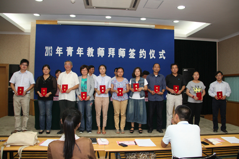 拜师仪式上,18位青年教师、12位教学指导教师和11位班主任指导教师在《拜师协议》上庄严地签下了自己的名字,确定了新教师的成长目标和指导教师的责任与义务。18位青年教师将接受自己恩师的悉心指导,23位指导教师向自己的爱徒给予了厚望。整个会场洋溢着一片温馨和谐的氛围。