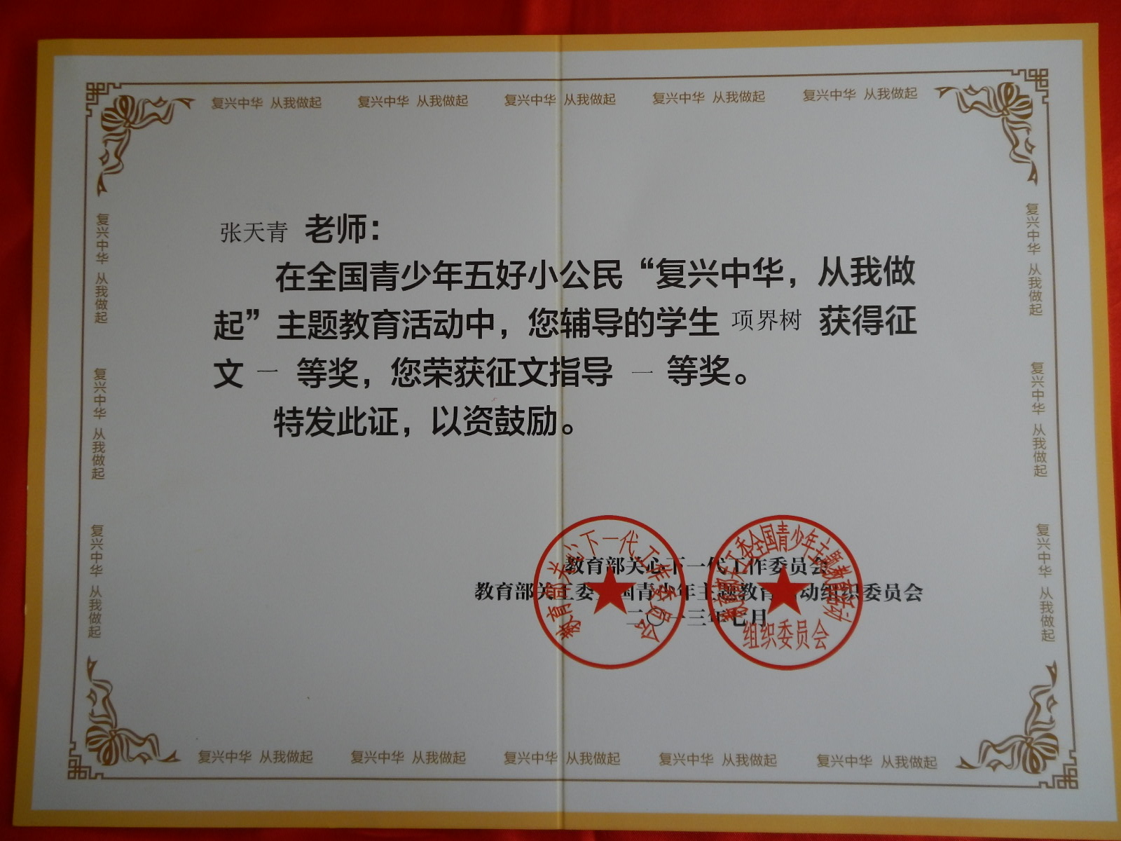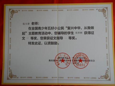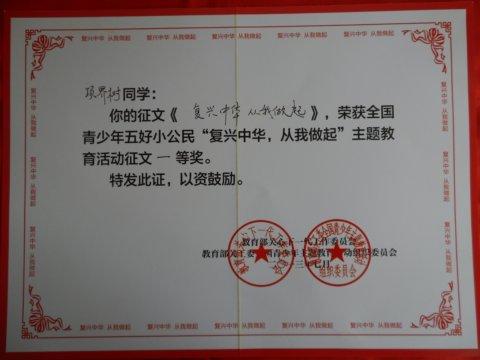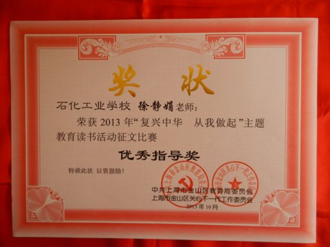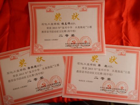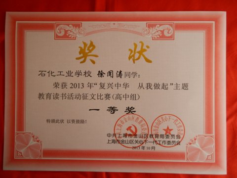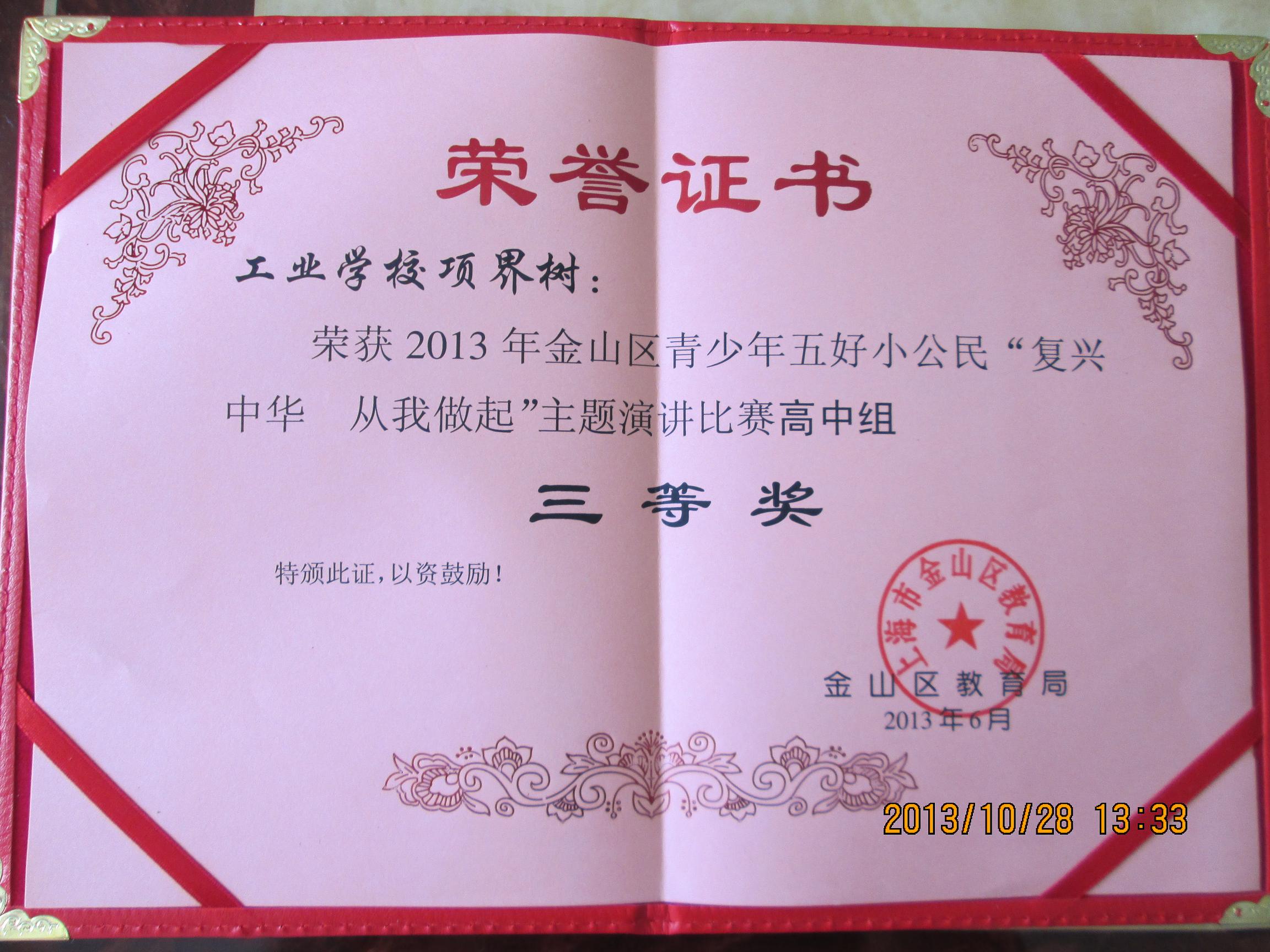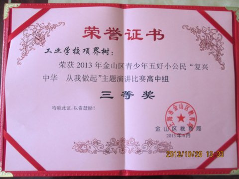 荣获2013金山区青少年五好小公民“复兴中华,从我做起”主题演讲比赛三等奖。
