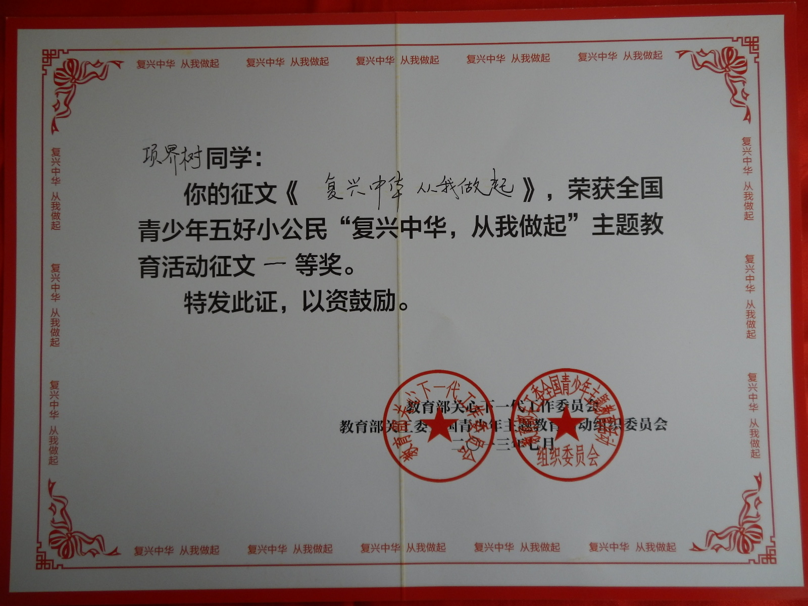 我校091高复3班项界树同学的《复兴中华,从我做起》荣获全国青少年五好小公民“复兴中华,从我做起”主题教育读书活动征文比赛高中组一等奖及征文演讲三等奖。另有四名同学荣获金山区级奖项,具体获奖情况如下: